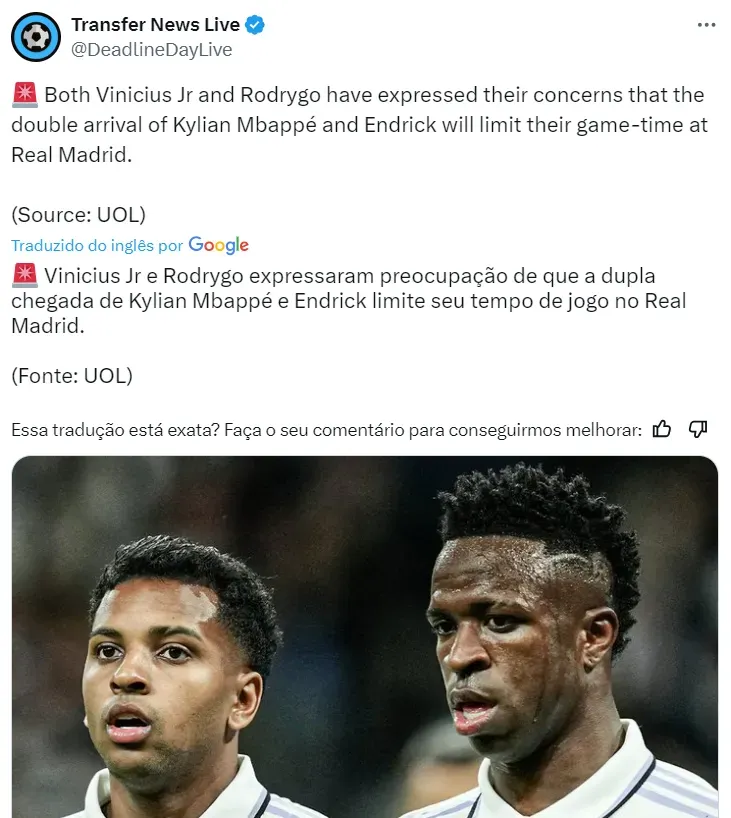 As chegadas de Endrick e de Mbappé deixam Vinicius Jr e Rodrygo preocupados com a falta de minutos. Nada que façam os dois ter dúvidas sobre o futuro, mas o sinal de alerta, é claro, é ligado, segundo aponta o UOL.