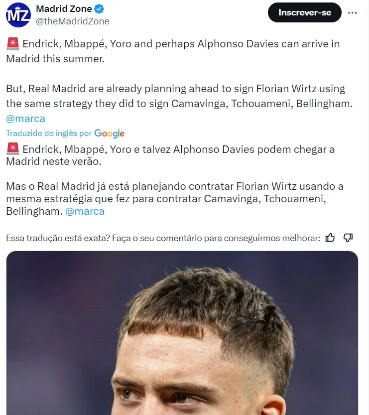 Há um plano também traçado por Wirtz, do Leverkusen, pensando em 2025. A estratégia adotada pela diretoria é a mesma usada nos sucessos que foram as contratações de Camavinga, Tchouaméni e, sobretudo, Bellingham.
