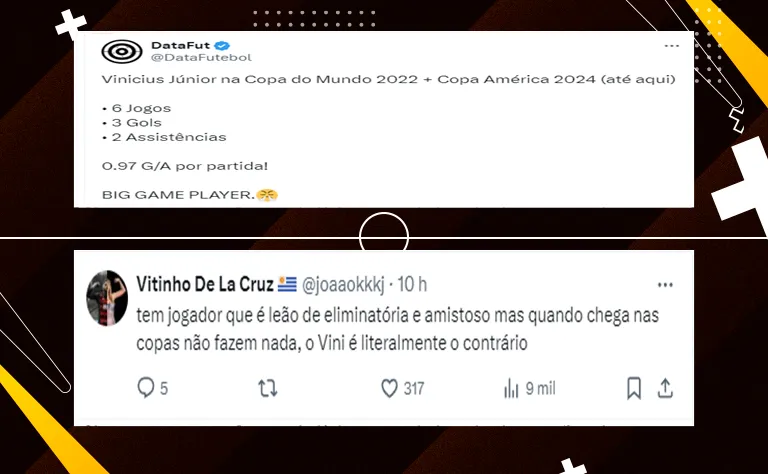 Ontem, o jogador foi o grande destaque da Seleção Brasileira na goleada por 4 a 1 sobre o Paraguai. Vinicius Júnior balançou as redes em duas oportunidades, ambas no primeiro tempo.