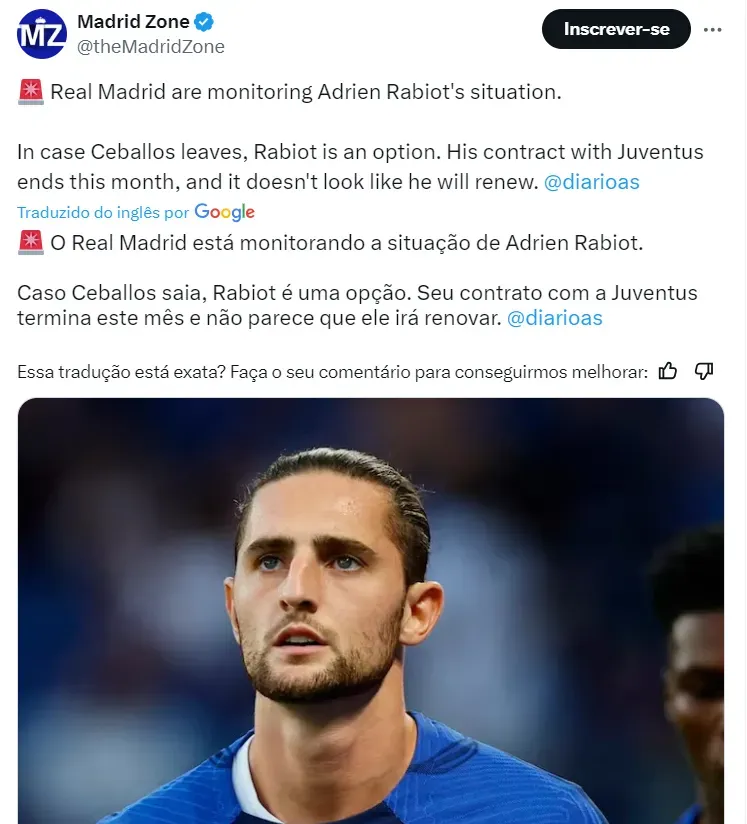 Rabiot, da França, que está em fim de contrato com a Juventus, da Itália, é alvo do Real Madrid. O francês surge como uma oportunidade de mercado para o clube merengue, segundo informações do diário AS.