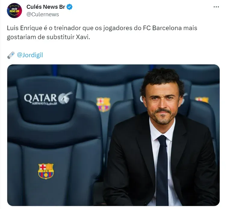 De acordo com Jordi Gil, os jogadores do Barcelona querem Luis Enrique de volta ao clube. Segundo a fonte, espanhol é o nome que os jogadores entedem como ideal para substituir Xavi.