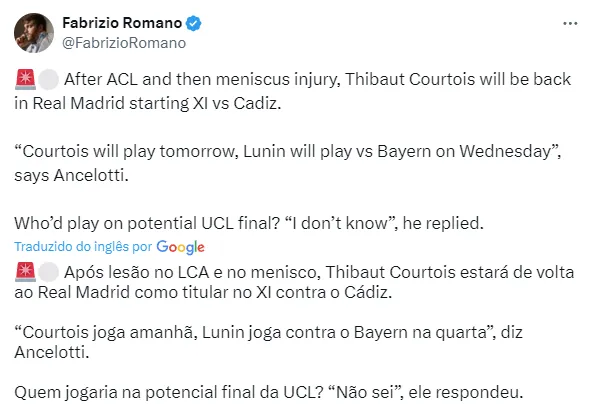 Ao mesmo tempo, Ancelotti e sua comissão técnica seguem preparando o time para a Champions League. Na ida, diante do Bayern e fora de casa, um bom empate por 2 a 2.