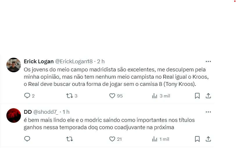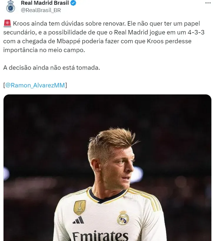 Essa possibilidade de um papel inferior no time merengue se dá pelo possível novo esquema de 4-3-3 com a chegada de Mbappé, o que faria com o alemão perdesse sua importância no sistema de meio-campo. A decisão ainda não está tomada, mas o sinal de alerta é ligado.