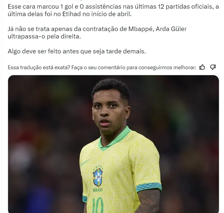 Um perfil no X (antigo Twitter) levanta críticas ao jogador brasileiro diante dos seus números atuais. “Esse cara (Rodrygo) marcou um gol e não deu nenhuma assistência nos últimos 12 jogos”, diz o perfil.