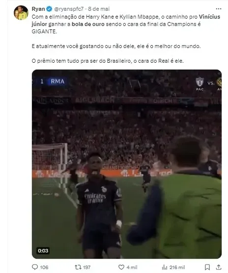 Apesar das ameaças, Vampeta mostrou confiança no potencial de Vinícius Júnior. Ele acredita que o atacante do Real Madrid tem uma grande chance de ganhar a Bola de Ouro se continuar desempenhando bem: “Vinícius está em uma fase incrível. Se ele continuar assim e ajudar o Real Madrid a conquistar a Champions League, ele será um dos favoritos”, concluiu.