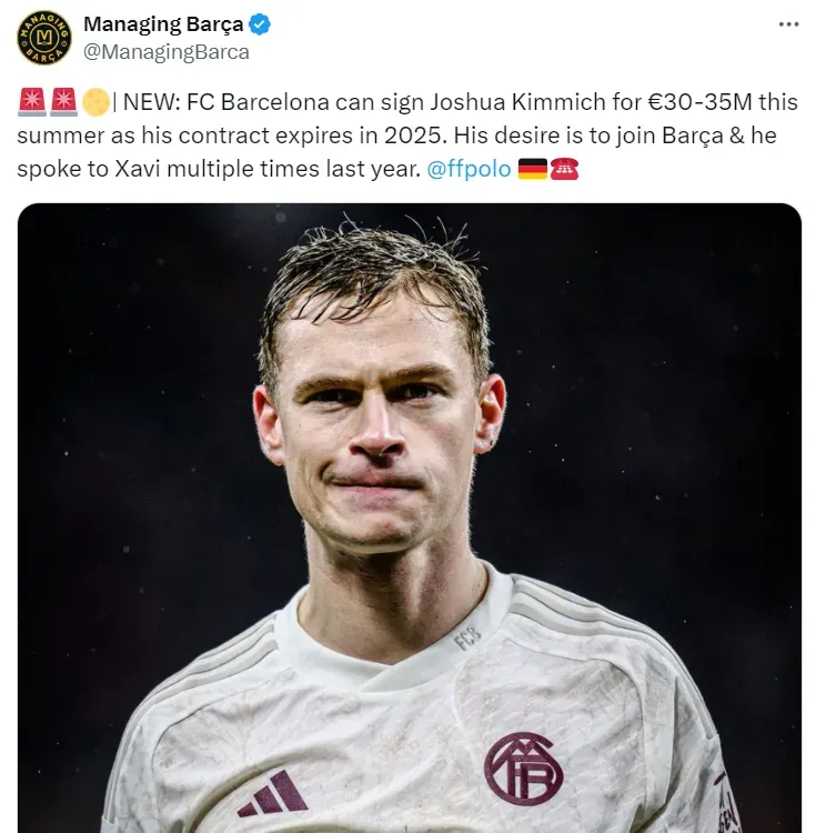 O Barcelona poderá contratar Kimmich por um valor entre 30 a 35 milhões de euros, já que seu contrato com o Bayern vai até o ano de 2025 e, nos bastidores, há o entendimento que ele não vai renovar.