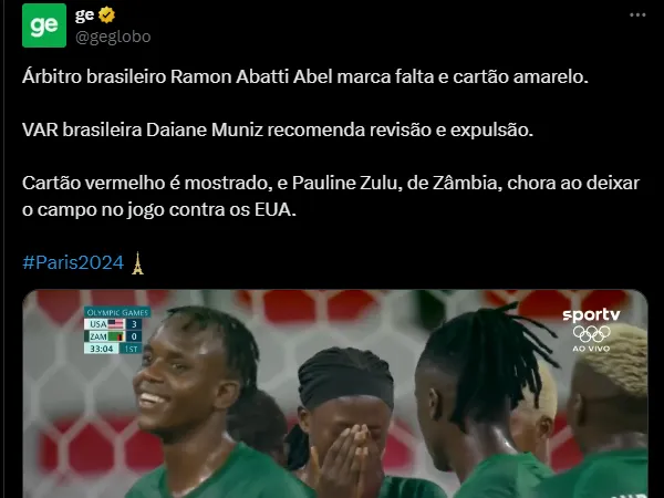 Pauline Zulu, da Zâmbia, havia sido advertida com cartão amarelo pelo árbitro brasileiro. No entanto, a VAR Daiane chamou o juiz de campo para alertar para a possibilidade de mudar a cor.