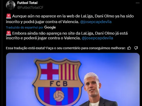 Informações traduzidas pelo Somos Fanáticos dão conta que a estreia de Dani Olmo no Barcelona será no próximo sábado (17), contra o Valencia, com horário e estádio confirmados.