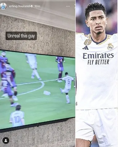 O craque norueguês compartilhou um vídeo em sua conta oficial do Instagram, no qual ele assiste ao replay do incrível chute de Jude Bellingham, que empatou o jogo em 1 a 1 para o Real Madrid. Na legenda, Haaland elogiou o desempenho do jovem jogador, escrevendo: “Esse cara é irreal.”