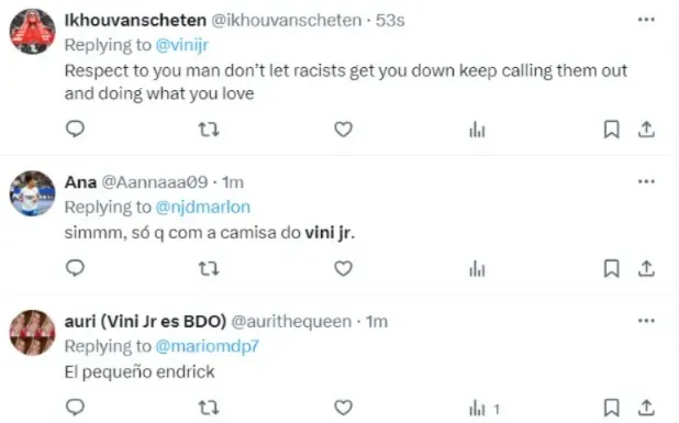 Além disso, Vinicius expressou sua satisfação por poder ajudar a mudar a mentalidade tanto na Espanha quanto no mundo, com o objetivo de reduzir o racismo na sociedade.