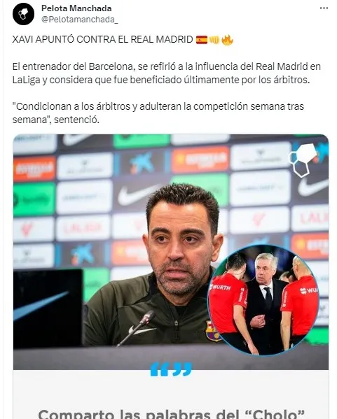 “Eu já disse que não gosto da forma como eles [Real Madrid] condicionam os árbitros, mas estão fazendo a mesma coisa a cada semana que passa. Creio que adultera um pouco a competição. Os árbitros entram em campo já condicionados, estamos vendo isso sempre”, afirmou Xavi em sua coletiva de imprensa.