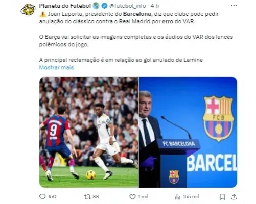 “Se, após analisarmos a documentação, concluirmos que houve um equívoco na avaliação do lance, como acreditamos, tomaremos todas as medidas necessárias para reverter a situação, sem descartar qualquer ação judicial”, declarou Laporta em seu comunicado. Ele também afirmou que buscará a anulação e repetição da partida entre Real Madrid e Barcelona, caso seja comprovado o erro.
