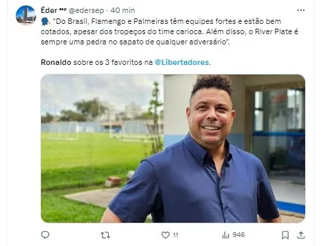 “Do Brasil, Flamengo e Palmeiras têm equipes fortes e estão bem cotados, apesar dos tropeços do time carioca. Além disso, o River Plate é sempre uma pedra no sapato de qualquer adversário”, afirmou Ronaldo.