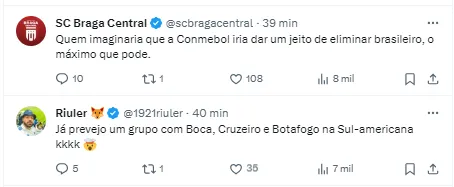 A dupla entrou na segunda das três fases prévias. A equipe carioca encara o Aurora (BOL) ou Melgar (PER), enquanto o time de Bragança Paulista pega o Águilas Douradas (COL). Em caso de as duas equipes brasileiras avançarem, eles se enfrentarão na terceira fase prévia. Ou seja, apenas uma equipe da dupla brasileira poderá se juntar às outras seis que já estão garantidas nos grupos.
