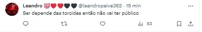 “(A presença de público) Vai depender dos torcedores. A partir de agora, os torcedores tem que se unir em torno do paz porque a segurança está acima de tudo. Se por acaso não tiver essa paz, é lógico que pode ter a possibilidade de ser sem público (…) Vai ser com público, às 17h e esperamos que essa paz solicitada possa reinar antes, durante e depois da partida para que não possa trazer nenhum tipo de consequência para que possam pensar de outra forma.“.