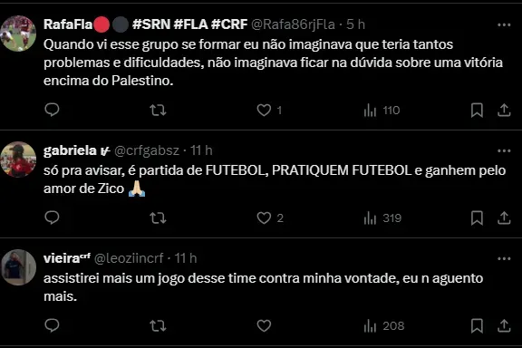 Atualmente, a equipe comandada pelo técnico Tite está em 2º lugar do Grupo E, com quatro pontos, exatamente um na frente do Palestino, adversário do Mengão logo mais.