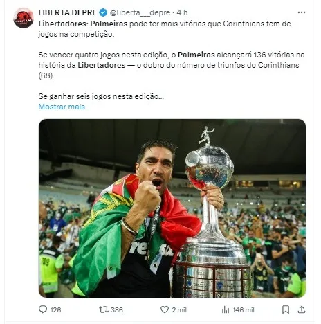 “O Palmeiras deverá poupar jogadores. Eu não sou muito fã disso, mas entendo que existe uma grande pressão para conquistar títulos. Então vamos ver como a equipe se comporta. Mas é uma competição que o palmeirense tem adorado ultimamente, e é claro que o clube entra mais uma vez como um dos grandes favoritos”, acrescentou o comentarista.