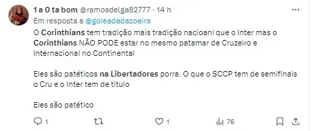 “Vai pra Libertadores pra quê? Vai fazer papelão! Perder pro Guarani, do Paraguai, Tolima, Argentinos Juniors, Del Valle… melhor não. Deixa quieto. Isso (título invicto) é o ‘processo Once Caldas’, que também ganhou em cima do Boca. Eu acho engraçado? O que raio o Corinthians quer fazer na Libertadores? Não dá.”, disse Flavio Prado, no programa Bate-Pronto, da Jovem Pan.