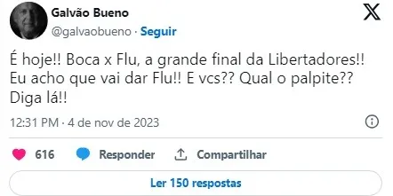 “É hoje!! Boca x Flu, a grande final da Libertadores!! Eu acho que vai dar Flu!! E vocês?? Qual o palpite?? Diga lá!!”, compartilhou o renomado ex-locutor esportivo da Globo.