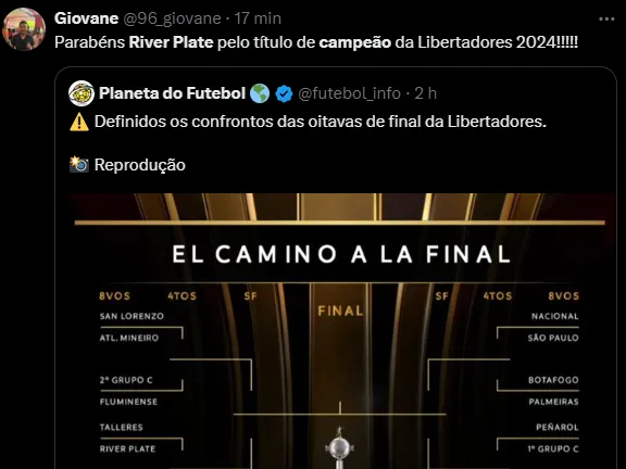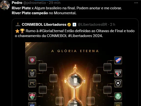 “O que prevalece é o campo, mas eu vou ser incoerente. Ainda mais depois do sorteio, o River Plate será campeão (da Libertadores)”, iniciou o jornalista ao analisar o chaveamento de hoje.