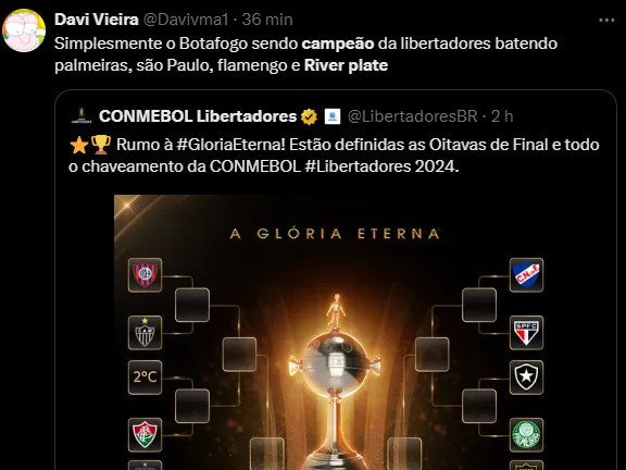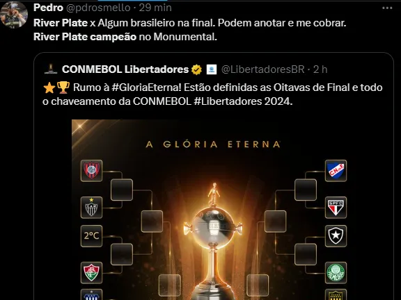 “A final é em Buenos Aires. Não foi anunciado, mas provavelmente será no Monumental. O River Plate pega esse sorteio e ficou no melhor cenário possível”, comentou o jornalista Rodrigo Bueno.