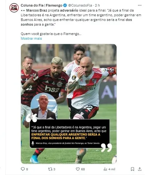 Para Braz, enfrentar um time argentino na final, especialmente em Buenos Aires, seria um sonho realizado para o Flamengo.