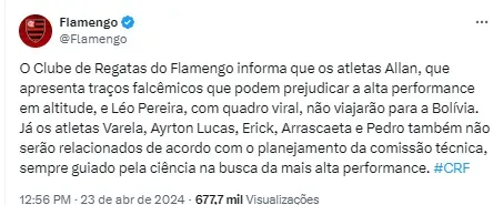 Léo Pereira e Allan, por exemplo, são os únicos que ficam de fora devido questões médicas. O zagueiro tem um quadro viral e o volante apresentou traços falcêmicos.
