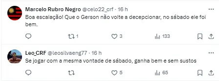 Uma provável escalação do Flamengo deve ter: Rossi, Varela, Fabrício Bruno, Léo Pereira e Ayrton Lucas; Allan, De la Cruz e Lorran; Gerson, Everton Cebolinha e Pedro.