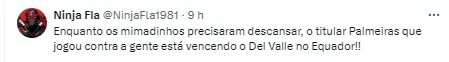 Muitos fizeram a comparação que a equipe do Palmeiras optou em levar seus jogadores importantes para o duelo contra o Independiente del Valle e conquistou a vitória pela Libertadores. Confira a manifestação dos torcedores abaixo (SIC).