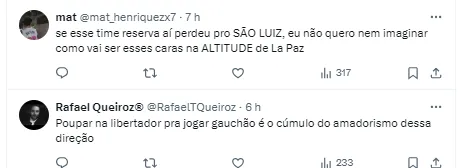 Muitos lembraram sobre a viagem que o elenco fará, já que a estreia será na Bolívia, outros ainda assim reforçaram a necessidade de contar com os jogadores titulares.