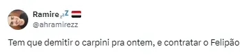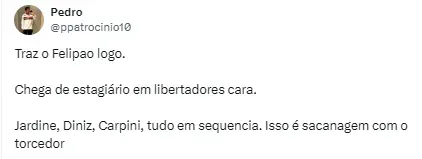 “20 dias jogados no lixo, Carpini é um treinador horrível. Time não tem nada, não cria, não marca. Vamos aproveitar as noites mágicas no Morumbis enquanto podemos. 3 jogos. #ForaCarpini”;