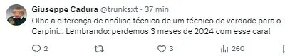 “Os jogadores foram muito bem neste sistema com quatro defensores, dois volantes, três jogadores mais avançados e um atacante. Mudei um pouco a característica e deixei de jogar com um extremo pela direita: colocamos um atacante (André Silva) que foi a primeira vez que jogou de ponta. Previ que ele poderia render. Ele se comprometeu e sabia que, com Calleri e Luciano pelo centro, poderíamos cruzar para área e seria complicado para o Barcelona. São jogadores de área, que sentem o gol. Fizemos um bom trabalho”, completou.