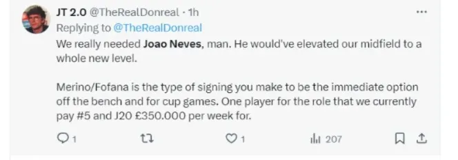 Após o jogo, o treinador elogiou o jovem, ressaltando sua rápida adaptação ao estilo da equipe. Também mencionou que, em apenas dois jogos, é evidente que Neves será um grande reforço, assim como Pacho e Désiré Doué.