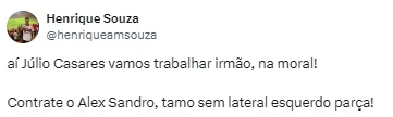 A diretoria segue mapeando o mercado da bola para suprir a carência na posição. Um nome que surgiu nos últimos dias foi Alex Sandro, que possui contrato com a Juventus somente até junho e ficará livre no mercado. O presidente Julio Casares comentou sobre o jogador.