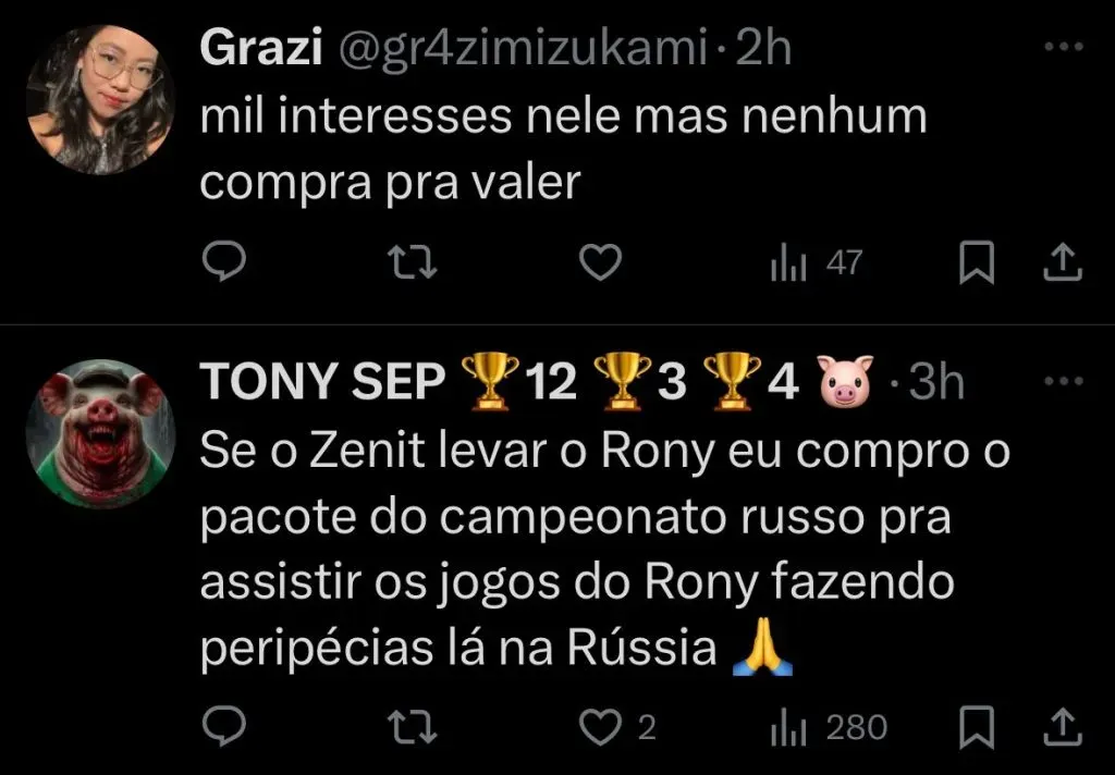 Além do Zenit, outros clubes do futebol brasileiro também têm demonstrado interesse na contratação de Rony, são eles o Athletico-PR, Santos e Cruzeiro.