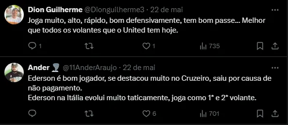 No entanto, o Barcelona deve lidar com a concorrência de grandes times da Premier League para contratar o ex-jogador de Cruzeiro, Corinthians e Fortaleza. Em resumo, Manchester United, Tottenham e Newcastle também desejam a chegada de Éderson na próxima janela de transferências de verão.