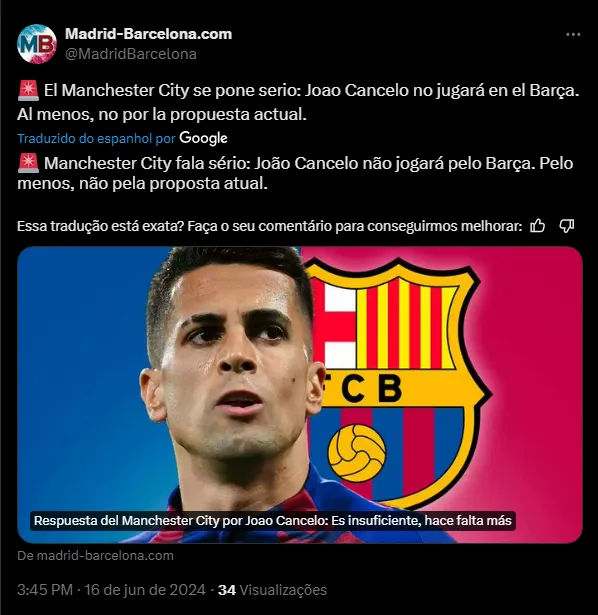 Há alguns dias, Guardiola falou sobre o interesse do Barça em João Cancelo: “Ele é nosso jogador e, se não houver acordo, terá que retornar na pré-temporada. Se ele quiser ficar no Barcelona, e os clubes concordarem, será feito de novo”, disse.