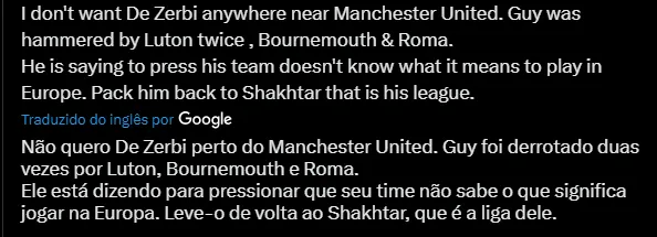 Em relação ao Manchester United, o interesse acontece em função do trabalho de Roberto De Zerbi com os jovens talentos, uma das grandes apostas dos Diabos Vermelhos para a nova gestão do clube. Com isso, a chegada do treinador pode acontecer na próxima temporada.