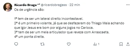 A ideia inicial é dar mais alternativas ao técnico Tite. Além de um volante para ser reserva de Pulgar, a diretoria Rubro-Negra deve rever a convicção que possui nos pontas e no setor de criação, que tem se resumido a Arrascaeta, por exemplo.
