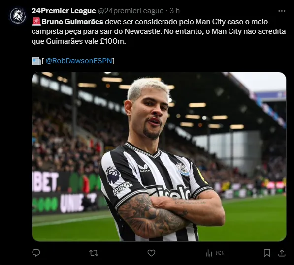 De acordo com o jornalista Rob Dawson, da “ESPN”, o Manchester City irá abrir negociações com Bruno Gruimarães se o jogador pedir para deixar o Newcastle. No entanto, os dirigentes dos Citizens acham que R$ 684 milhões é um valor muito elevado.