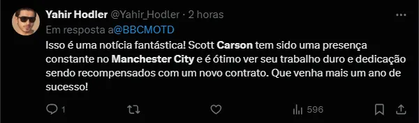 “Estou ansioso por mais uma temporada como parte deste time incrível do City. Todos os dias trabalho muito e aprendo algo novo com Pep e com este grupo de jogadores de classe mundial”, disse Carson, em entrevista aos canais do clube.