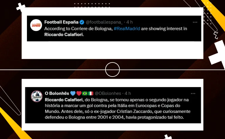Trata-se do zagueiro Riccardo Calafiori, da Seleção Italiana e do Bologna. O defensor tem 22 anos e passagens por outros clubes do futebol italiano, como a Roma, onde se profissionalizou, e o Genoa, além de ter atuado pelo Basel, da Suíça.