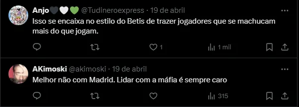 Com isso, o Real Madrid recebeu sondagens do Real Bétis e Sevilla, rivais da La Liga, para contar com Arda Güler na próxima temporada. No entanto, o próprio jogador recusou o interesse adversário e mostrou vontade em permanecer no Santigo Bernabéu.
