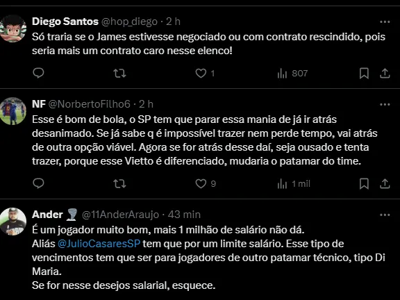 Na comparação de Vietto com James desde quando o camisa 55 desembarcou no Morumbis, é nítido quem está na frente e tem mais potencial de retorno esportivo neste momento da carreira.