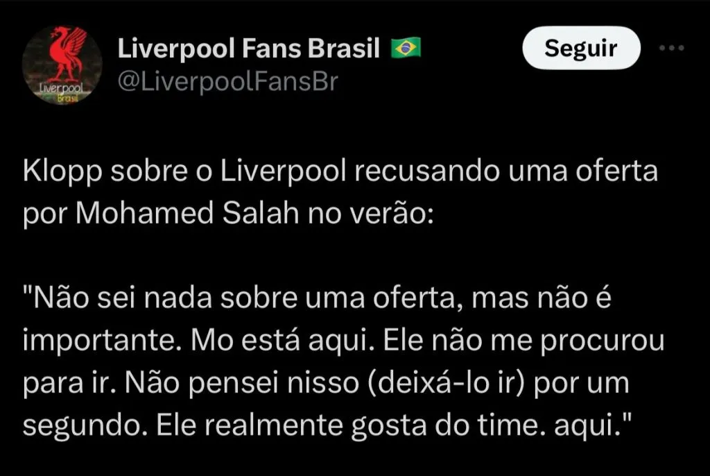 O portal ainda completa afirmando que o Liverpool deve receber cerca de 150 milhões de Libras (R$913 milhões de reais) pela negociação.