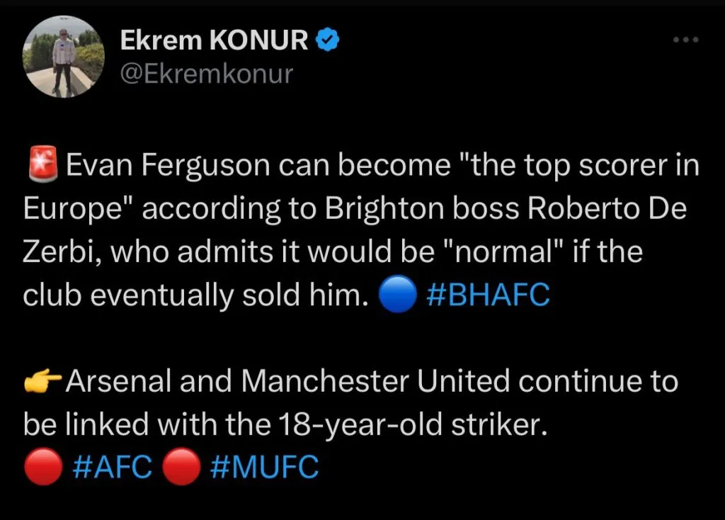 Segundo informações do jornalista Ekrem Konur, o Arsenal e também o Manchester United estão monitorando a situação do atacante Evan Ferguson, do Brighton.