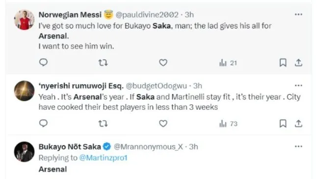Mikel Arteta, treinador do Arsenal, comparou a dificuldade de enfrentar Bukayo Saka à de enfrentar Lionel Messi depois da vitória do time sobre o Wolves. Isso aconteceu depois que Saka fez uma grande partida, marcando um gol e dando uma assistência em seu retorno à Premier League.