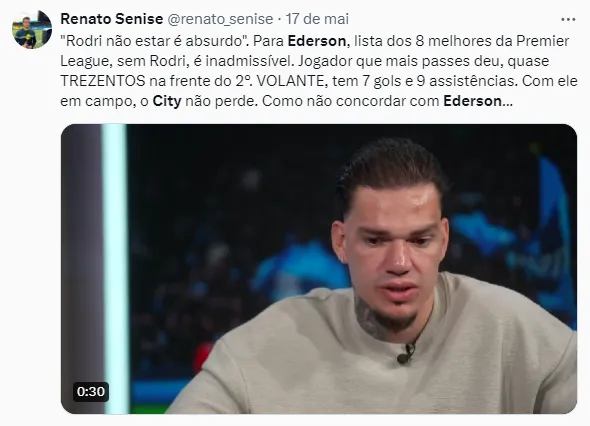 Em entrevista aos canais ESPN, Ederson esteve indignado com o fato do meio-campista Rodri, seu companheiro de time, não ter aparecido na lista de indicados ao prêmio de melhor jogador da temporada 2023/2024 da Premier League.