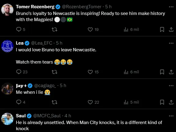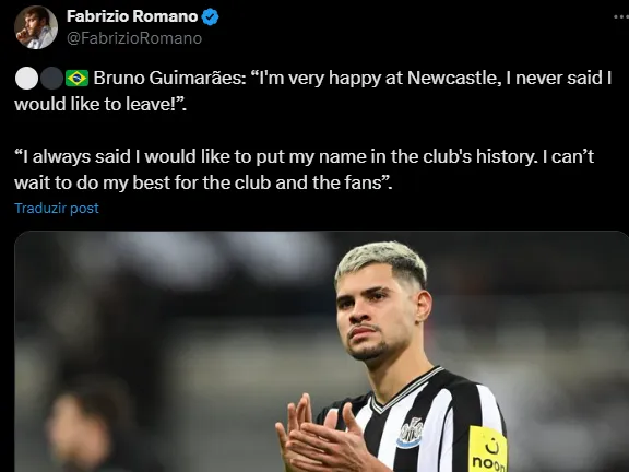 Apesar de ter sido especulado fora do atual clube, Bruno não esconde a definição que tem na carreira: “Estou muito feliz no Newcastle, nunca disse que gostaria de sair”, frisa conforme publicou o jornalista Fabrizio Romano.