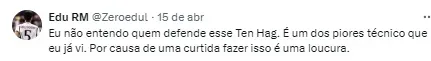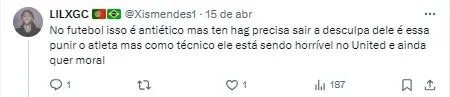 “Ten Hag culpando sutilmente Garnacho na coletiva de imprensa após o jogo… não é uma boa ideia jogar debaixo do ônibus um jovem de 19 anos que realmente fez um bom trabalho para você nesta temporada. Mas, novamente, ele está claramente com medo de incomodar os que ganham mais”, publicou o torcedor.